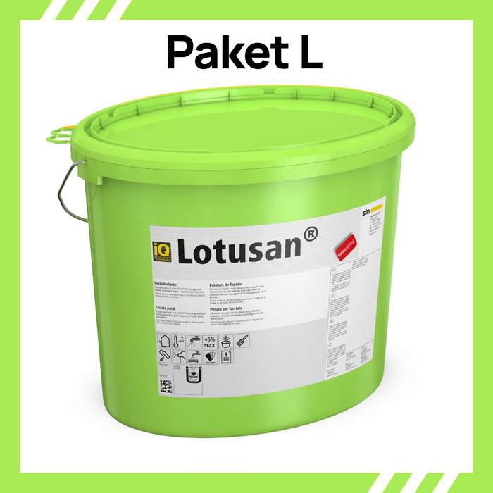 Jetzt sparen mit unserem Paket L, bestehend aus 15 x 12,5 l Lotusan in Weiß für ca. 930 m² bei einem Anstrich