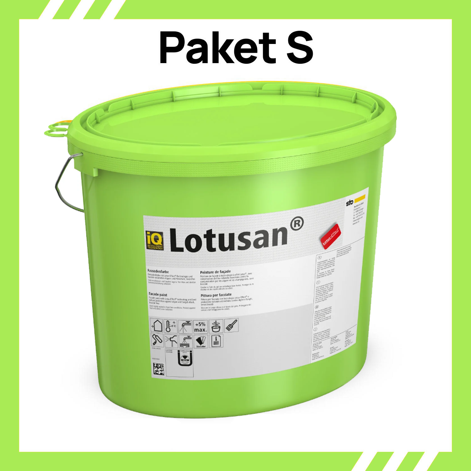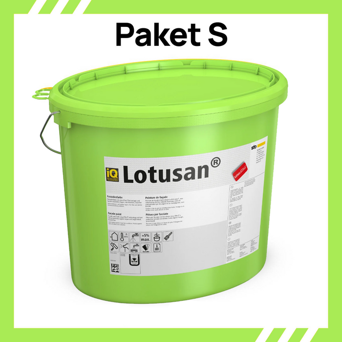 Jetzt sparen mit unserem Paket S, bestehend aus 5 x 12,5 l Lotusan in Weiß für ca. 310 m² bei einem Anstrich