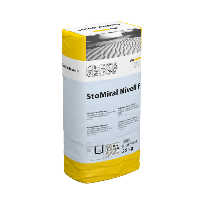 StoMiral Nivell F ist ein mineralischer Feinputz für den Innen- und Außenbereich, ideal geeignet für quarzsandähnliche, filzbare Oberflächen. Er lässt sich leicht strukturieren und ist besonders für Faschen einsetzbar. Der Putz kann aus allen mineralischen Gründen verwendet werden. Bei gefilzter Ausführung im Außenbereich ist ein zusätzlicher Anstrich erforderlich. Mineralischer Oberputz nach EN 998-1, filzbar in feiner Struktur